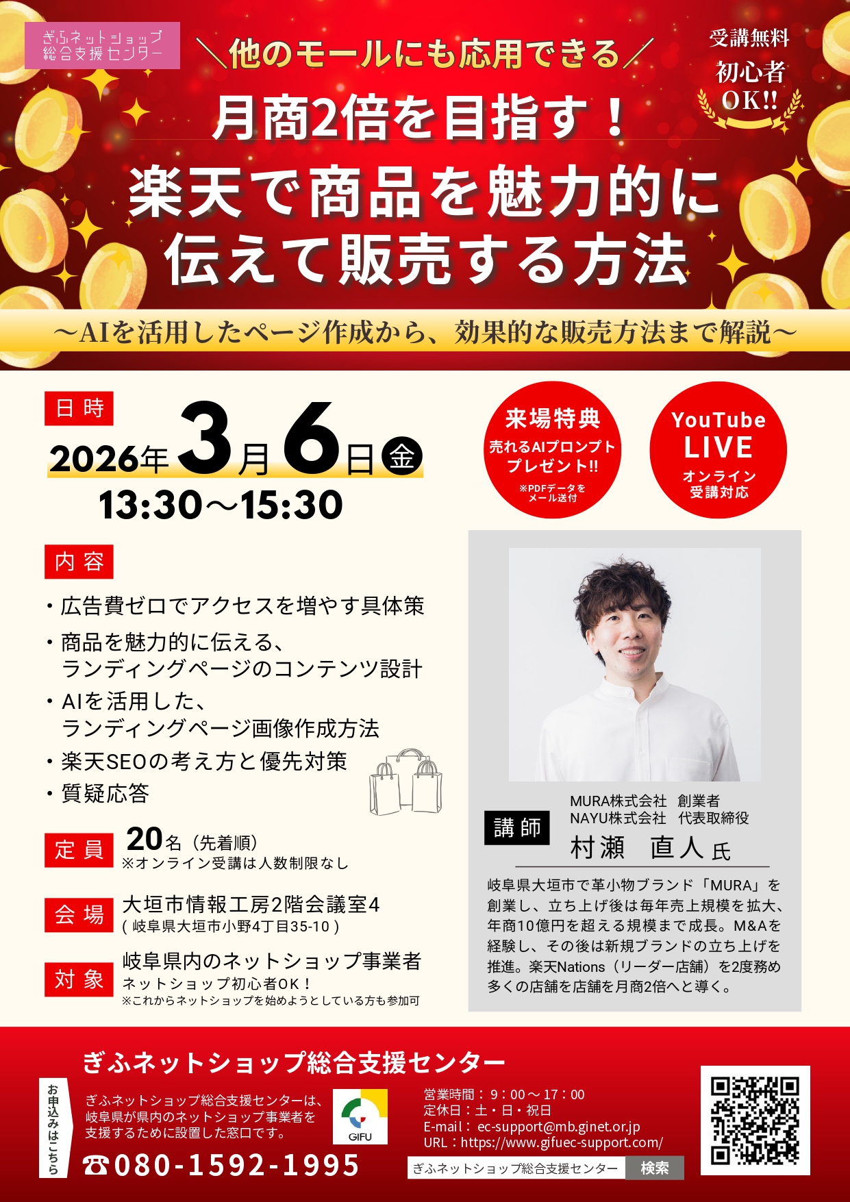 ぎふネットショップ総合支援センターより、月商2倍楽天セミナーのご案内
